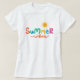 Sommarstämning och solsken design kvinnors t-shirt som är perfekt för att komma in i det vackra semestertillståndet. Denna färgglada design har livfulla färgbokstäver och en illustration av en gul sol och stämning i stilfullt kalligrafi.