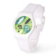Sommartemeklockor för kvinnor som har en sommarbakgrund och akvaribakgrund med vit och svart grönt av Handflatan träd och surfbrädor. Surfplattorna har stänk av blå vatten runt dem. Underbar gåva till alla som kärlek Summer. Många stilar att välja mellan! Bevakningsnummer kan tas bort om du föredrar att titta utan dem.