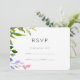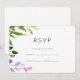 Detta vackra och färgrika vattenfärg botaniska bröllop RSVP-kort har vackra rosa, lila och gröna blad och en enkel typografi.