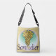ZoeSPEAK:s ursprungliga illustration på denna Crossbody Tote Bag har en gyllene samling druvor. En sån här guld-stift bärs av en sommare. En sommar, eller vin steward, är en välutbildad och kunnig professionell i vin som specialiserar sig på alla aspekter av vin-tjänsten samt vin och matparning. I detta exempel lyfter druvorna upp den djupa lilan brev "sommelier", som solsken på vingårdarna. En rund grönt ekar flaska i vin och vinodlingens gröntar och djupa . En kork-texturerad bakgrund med ett grovt kant omger scenen.