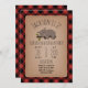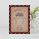 Ett födelsedagsfest inbjudan med en illustration av en baby-björn i sömnläge i träd gren. Anpassa texten. Bakgrunden är rött och svart lumberjack inspirerad buffalo plaid mönster.