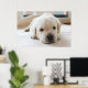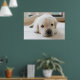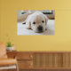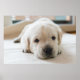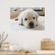 Stängbild av en uttröttad 2 veckors gammal labradobägare ljugande ner på en vit matta och tittar inom stängda dörrar