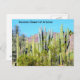 Massor av kaktusar i öknen med blå himmel och ett berg i bakgrunden plus ett palmer.
