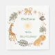 Tyst djungeltema för ett barns födelsedagsfest. Text är helt anpassade: välj färg eller annat typsnitt. Framsidan är inramad med djungeldjur, växter och blommor.Färg är djungelns grönt, solig gult, guldbrun och mjukt grått. Roligten ser ut att bli ett spännande party för små.