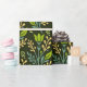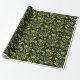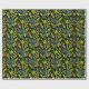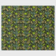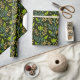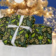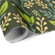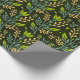 Seamless floral pattern with green leaves and buds on a dark background, featuring intricate blue and beige branches, evoking a natural, elegant feel.