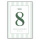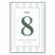 This wedding table card features a minimalist and elegant design with a large, bold number "8" in deep forest green at the center. The layout is vertically oriented with ample white space, creating a clean and sophisticated look against a background of subtle light green and white vertical stripes. The typography includes a mix of cursive script for "table" and simple serif fonts for customizable names and date, ensuring readability and visual harmony. The overall mood is one of sophistication and celebration, perfect for formal gatherings or weddings, conveying freshness and growth through its color palette and modern aesthetic.