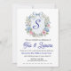 Elevate your next sophisticated garden gathering, ladies' luncheon, or bridal shower with this exquisite, watercolor-illustrated invitation. The design features a delicate light blue and pink floral wreath composed of lush hydrangeas, roses, and lush greenery, centered around a classic watercolor crest shield. At the top of the crest sits a charming light blue ribbon bow.