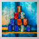 Pyramid med tio tomma soppa-burkar av vitt, blått och rött färg mot grym metall-vägg. Vissa burkar skjuts igenom. Poster att dekorera ett hem eller ett kontor för vem som helst.