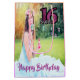 En presentsäck för en sexton-gammal flicka, med texten "Sweet 16" och texten Grattis på födelsedagen på lila. "Söt 16" i faux glitter. En ultraviolett, rosa och persikobaksida av färgaden. Mall för ditt foto på födelsedagsflickan.