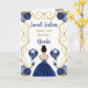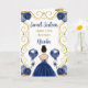 Den här inbjudan till födelsedagskort innehåller en elegant guld ram, en vacker prinsessa med brunt hår och en marin blå klänning, blommor och ballong.