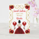 Den här inbjudan till födelsedagskort innehåller en elegant guld ram, en vacker prinsessa med brunt hår och en röd klänning, blommor och ballong.