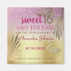 Snyggt, elegant, unik, guld-folie förkroppsligade flamingosilhuett i kombination med den vackra bakgrunden för glitter och guld och med gigantiska rosor för handflatan med tropiska guld. Trendig, modern, ädel sötsak 16-årsdag - Spara datum magneter. Du kan enkelt anpassa all inslag och grafik - njut av och kombinera dem på bästa sätt!