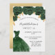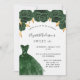 En modern, snyggt och glamorös inbjudan till en svensk 16, 16:e födelsedagsfest. På framsidan: En vit bakgrund med en grönt-klänning och grönt ro, blommigtar. Namn är skrivet med ett modernt handskript i stil. Anpassa och lägg till information om party. Baksida: Faux guld bakgrund.