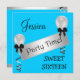 Manlig eller kvinnlig födelsedagsfestinbjudan. Alla evenemang, firanden, annonseringar och födelsedagsinbjudningar. Lämplig för alla åldrar och evenemang. Svar på begäran finns tillgängligt på liknande sätt. Vacker rolig silvervit metallplatta med texten Party Time överst på ljus vacker blå med ljust silverkanter. Ballonger, serpentiner och svarta bandbågar. Anpassa stil och storlek på typsnitt för att anpassa.