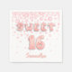 En napkin för en flicka söt 16:e födelsedagsfesten. Vit bakgrund och tex: Söt 16. Texten är skriven med trendiget faux ro guld, rosa ballongskript/text. Med diamanter från Faux ro guld färgad . Mall för ett handskript för färgaden namn, ro guld, med stil.