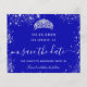 En flickaktig och trendig Save the Date för en Sweet 16, 16-årsfest. En kunglig blå bakgrund. Dekorerad med falskt silverglitterstoft och en tiara, krona. Texten: Spara datumet är skriven med en stor trendig handstilsstil.