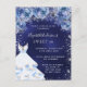 En modern, snyggt och glamorös inbjudan till en svensk 16, 16:e födelsedagsfest. En marin bakgrund med faux silver glitter-gnistor, en klänning och blått ro, blommigtar. Den blå bakgrunden färg är ojämn. Namn är skrivet med ett modernt handskript i stil. Anpassa och lägg till information om party.
