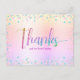 Här är en roligt, ett sparsamt sätt för födelsedagstjukan att visa sin uppskattning för alla som stödde hennes milstolpe! Skicka ut det här fantastiska, enkla, festliga, moderna tack för personligen som du vykort. Regnbågsmanustypografi, tillsammans med festiv turkos, lila rosa och guld konetti, täcker över en regnbåge ombre foil metallisk bakgrund. Anpassa till hennes namn. Skriv en anteckning på anpassningsbarna på baksidan eller lämna tom för ditt handskrivna meddelande. Lägg även till returadressen. Underbar för den bakåtsträvande modesta som kärlek moderna glitter och glam och garanterade att lägga till en snyggt till hennes korrespondens! Skriv bara i namn längst fram, lägg till en personlig och returadress på baksidan, och du kan enkelt anpassa det här tack du vykort. Var snäll och meddela mig med eventuella frågor eller förfrågningar.