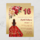 En modern, snyggt och glamorös inbjudan till en svensk 16, 16:e födelsedagsfest. En faux guld-bakgrund, en flicka med röd klänning och guld och röd, rosa och gyllene ro, blommigtar. Namn är skrivet med ett modernt handskript i stil. Anpassa och lägg till information om party. 1 lakan = 1 inbjudan tryckt kant till kant.