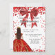 En modern, snyggt och glamorös inbjudan till en svensk 16, 16:e födelsedagsfest. En vit bakgrund med gnistor, en röd klänning och en röd båge. Namn är skrivet med ett modernt handskript i stil. Anpassa och lägg till information om party.