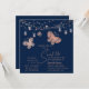 Söt 16 Rosa Guld Fjäril Chic Moderna Födelsedagsinbjudningar har eleganta rosa guld fjärilar med strängljus på en blå bakgrund med din Sweet 16-inbjudningsinformation nedan. Anpassa genom att redigera texten i textrutorna. Designad för dig av ©Evco Studio www.zazzle.com/store/evcostudio