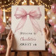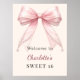 Välkommen gäster med denna eleganta coquette Söt 16 födelsedagsaffisch. Designen har en stor, mjuk rosa rosett prydd med ömtåliga pärlor mot en ren blush krämvit bakgrund. Detta är ett sofistikerat val för en dotters högtid eller vilken tjejig födelsedagsfest som helst.