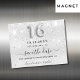 Ett giftigt och trendig Spara datummagnetkortet för en svensk 16, 16:e födelsedagsfest. En faux silver tittar bakgrund som dekoreras med faux glitter drops, färgdroppstift. Anpassa och lägg till ett datum och namn. Svart färgad brev. Texten: Spara datumet skrivs med ett stort trendig-handskript i stil.