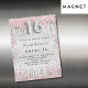 En modern, snyggt och glamorös inbjudningsmagnet för en flickas söt 16:e födelsedagsfest. En faux silver-tittar bakgrund, dekorerad med damm från rosa och faux silver glitter. Anpassa och lägg till ditt namn och information om party. Nummer 16 skrivs med ett stil-skript med ballong.