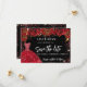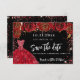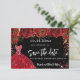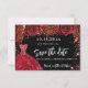 Ett giftigt och trendig Spara datum för en svensk 16, 16:e födelsedagsfest. En svart bakgrund dekorerad röd ros, röda faux glitter-gnistor och en röd klänning. Anpassa och lägg till datum och namn/ålder. Texten: Spara datumet skrivs med ett stort trendig-handskript i stil.