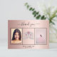 En elegant, enkel, söt 16-tacksam personlig med ditt eget foto. Lägg till 3 av dina födelsedagsfoton, lodrät storlekt, ett datum, namn och tackkortet. En faux metallisk bakgrund i ro tittar bakgrund med svart text och ram. Texten: Tack på framsidan och namnen på baksidan skrivs med ett snyggt-handskript med dekortecken.