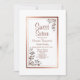 En elegant guld/koppargränsad blommigt sweet sixteen med varma ro bladdekorationer i guld i diagonalhörnen och brinnande text.