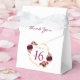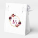 Elegant och glamorös i 16:e födelsedagsfesten. På framsidan: brev och texten: Tack. Framsida och baksida: En chic vit bakgrund med faux guld geometric ram. Dekorerad med mörkens lila och burgundblommor, ro och boho stil fjädrar. Namn är skrivet med rosa handskript i stil. Datumet skrivs med svarta siffror och 16 års ålder i burgundi.