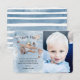 Sott tackkort från födelsedagspojken! Designen har en blå akvarell himmelbakgrund med små stjärnor och fluffiga moln, en liten pojke som flyger ett vintage flygplan, varmluftsballonger, ett foto du väljer och en tackmall som är lätt att anpassa.
