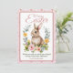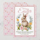 Njut av vårens sötma med denna bedårande akvarell kanin som är bofast i en frodig blomsterkrans med mjuka persikor på peonier, gula ranunkler, salvia grönska och ömtåliga suckulenter. Den centrala illustrationen är inramad av en mjuk rosa rundad kant, allt på en charmig upprepad bakgrund av små morötter, kaniner och orden ”Hi”, ”Love”, ”Cute”, ”Rabbit” i lekfull skrift på texturerat rosa papper.