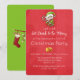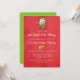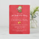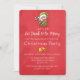 En festlig julfestinbjudan med en söt alv som håller i en röd och vit randig godisstav. Texten är separerad av ett par gyllene klockor. Satt på en ljusröd julbakgrund.