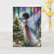 Julkort. Illustration av afroamerikansk älva eller ängel som dekorerar en julgran i en förtrollad skog.