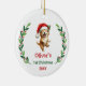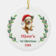 Fira en speciell högtid med denna personliga keramikprydnad för Babys första jul, med en söt valp som bär en festlig tomtehatt, omgiven av delikat grön och röd vintergrönska. Denna charmiga design är tryckt på båda sidor för en vacker och hjärtlig souvenir. Anpassa barnets namn och år för att skapa en meningsfull juldekoration som familjer kommer att värna om i många år framöver. Om du önskar kan texten ytterligare anpassas genom att ändra färger, teckensnitt och "första jul"-meddelande. En perfekt julpresent för nyfödda, spädbarn, nya föräldrar och mor- och farföräldrar. Denna söta och moderna prydnad blandar tidlösa julfärger med ett underbart illustrerat djur, vilket gör den till ett vackert tillskott till julgran
