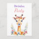 En söt liten baby giraff omgiven av rosa och lila blommor akvarell illustration flickkalas inbjudan.