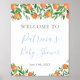 Välkomstskylt som matchar mina Apelsiner / Blå Dusch pappersvaror i samma design. Visas här för en babyfest men all text är helt anpassningsbar. Du kan lägga till eller ta bort textfält.