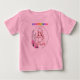 Bedårande bebis-flicka T-shirt i mjuk rosa med en söt tecknad bild av en liten flicka som sitter och läser inuti en blomster cirkel.
