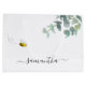 En chic vit bakgrund. Dekorerad med akvarellmålad eukalyptusgrönska, lövverk och en söt, glad leende bin. Personifiera och lägg till ett namn. Namnet skrivs med en modern handskriven stilspråk med svängar. För att behålla svängarna, radera endast provnamnet, lämna utrymmena eller emojierna före och efter namnet.