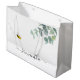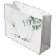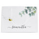 En chic vit bakgrund. Dekorerad med akvarellmålad eukalyptusgrönska, lövverk och en söt, glad leende bin. Personifiera och lägg till ett namn. Namnet skrivs med en modern handstilsbetonad script med svängar. För att behålla svängarna, radera endast provnamnet, låt utrymmena eller emojierna före och efter namnet vara kvar.