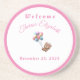 Designen har bilden av en teddybjörn som bärs av ballonger som visas i mitten. Ordet "Välkommen" visas ovanför barnets namn, som visas i en båge ovanför bilden. Förfallodatum visas nedan. All text är i rosa bokstäver. Designad för att samordna med "Söt björn och ballonger" dusch och barnkammarsamling. Perfekt för baby shower.