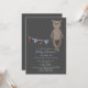 En baby shower inbjudan med en illustration av en brun teddybjörn med lapptäckeinspirerade randiga öron. Björnen sitter på en sträng med matchande randigt och blått bunting. Bakgrunden är grå. Anpassa texten med detaljer om ditt evenemang.