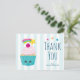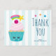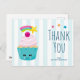 Födelsedag tack-kort med en ljusblå och vit randig bakgrund. Överlagd är en söt blå cupcake med rosa glasyr och ett kawaii-leende ansikte. En körsbär på toppen har också ett sött ansikte. En stjärnfall flyger i luften.