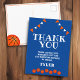 Söt blå och orange sport basket födelsedag tack-kort. Basket-temat tack-kort för barn - flicka och pojke. Designen har basketbollar och flaggor i orange och vita färger. Bakgrunden är blå. Personalisera kortet med ditt barns namn. Du kan också ändra tack-texten och meddelandet och skriva ditt eget. Bra för en pojke eller en flicka som älskar basket och andra sporter.