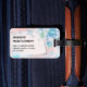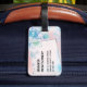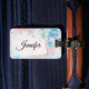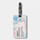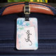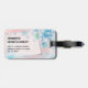 Ett bagagemärke med vackert blåa blommor på rosans bakgrund. En bild av en rektangulär formad anteckningsbokssida som läggs ovanpå så att du kan skriva texten inuti.