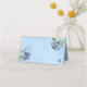 Fira din blåbärsfest med det här platskortet. Riva blåbär och löv i vattenfärgsform tvättar bakgrund mot en blå vattenfärg. Använda vid en möhippa för blåbär, babydusch eller baby sprinkle, en första födelsedagsfest för bär. Tillgängligt med matchande produkter.