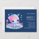 Födelsedagsinbjudan med en bild av en söt, flickaktig bläckfisk med en blomma på huvudet. Stora, ljusa ögon och ett vänligt ansikte.