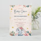 Bedårande baby elefant med en krona av rosa blommor. Bakgrunden är en ljusrosa med gyllene stjärnor och blommor.